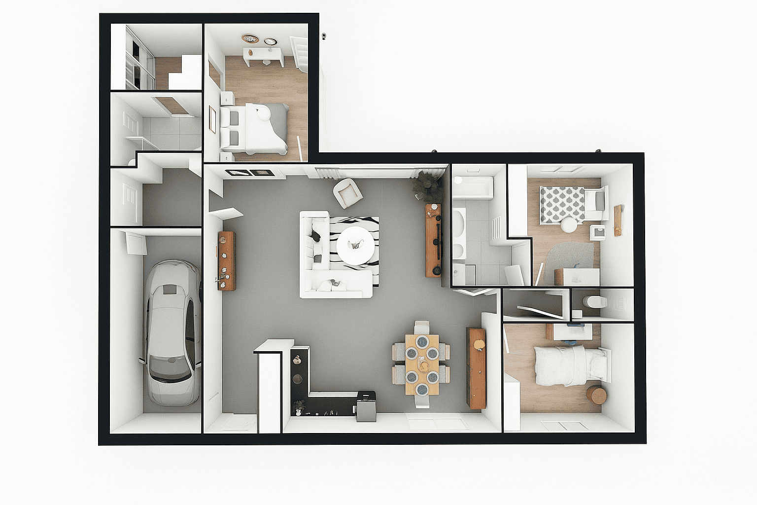 Maison de plain-pied en L  à l’architecture traditionnelle avec garage et 3 chambres avec une surface habitable de 125 m².